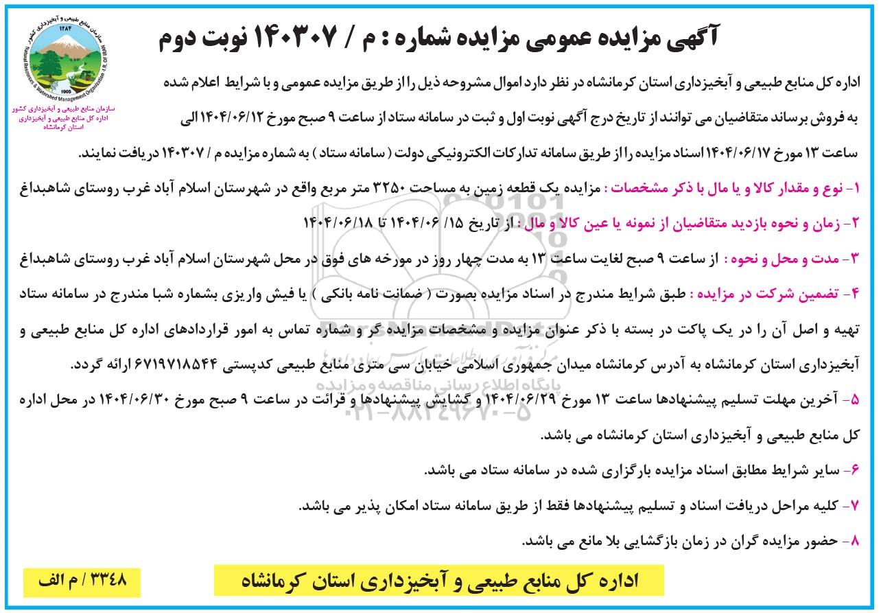 اداره کل منابع طبیعی و آبخیزداری استان کرمانشاه در نظر دارد اموال مشروحه ذیل را از طریق مزایده عمومی و با شرایط اعلام شده به فروش برساند