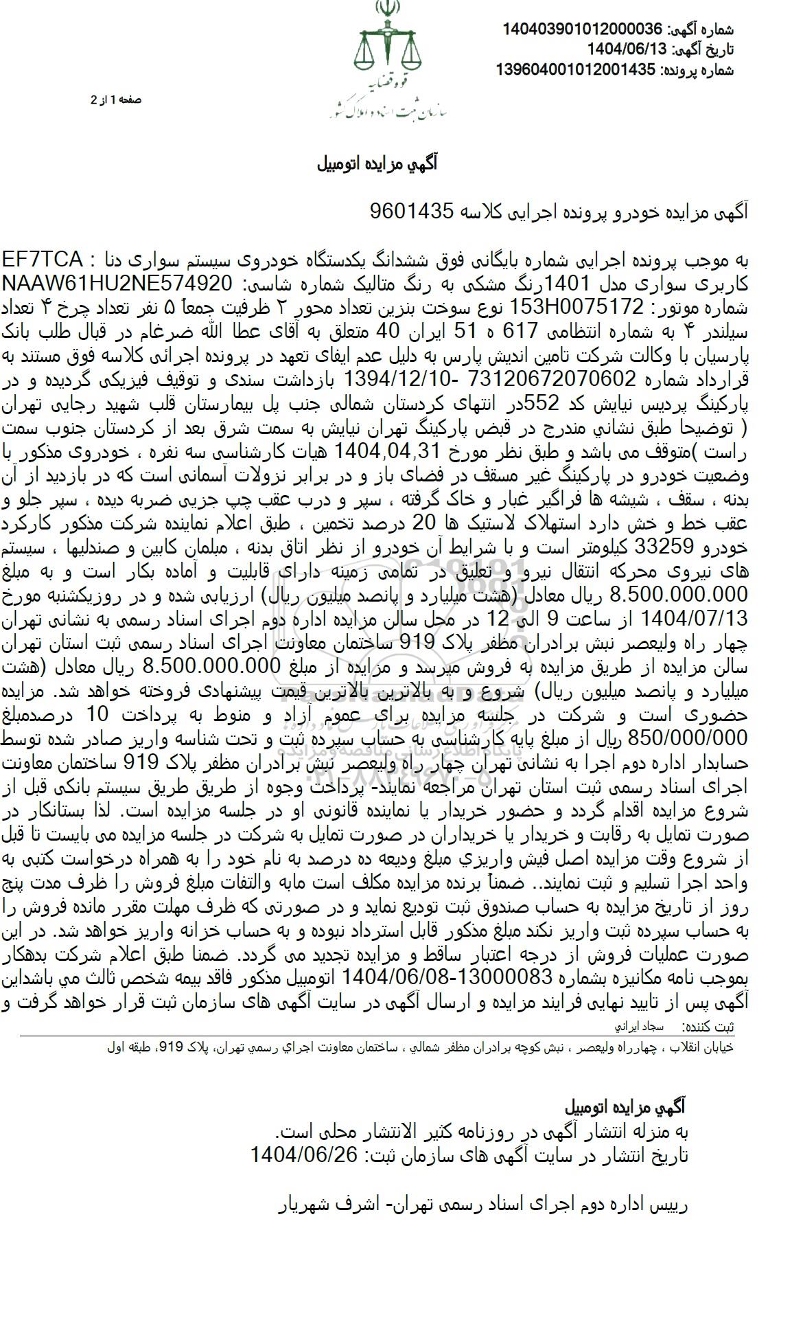 مزایده فروش یکدستگاه خودروی سیستم دنا مدل 1401 رنگ مشکی متالیک