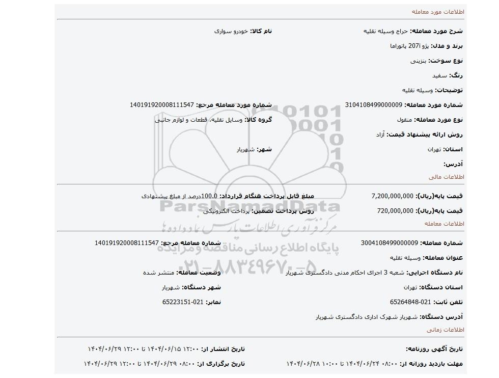 مزایده عمومی مزایده وسیله نقلیه برگزار میگردد. از کلیه افراد متخصص و شرکتهای واجد شرایط دعوت به عمل میآید تا در این مزایده با کد خبرگزاری پارس نماد : 9506247 شرکت نمایند تاریخ شروع مزایده : 1404/06/15 مهلت شرکت در مزایده: تا پایان روز 1404/06/29