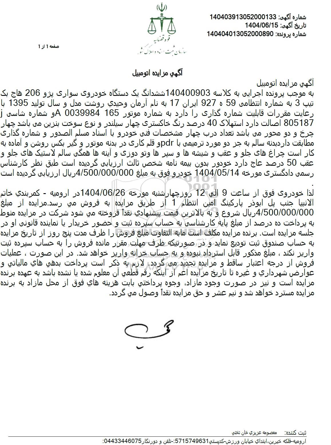 تاریخ مزایده ساعت 9 الی 12 روز چهارشنبه مورخ 1404.06.26 در ارومیه - کمربندی خاتم الانبیا جنب پل ابوذر پارکینگ امین انتظام 1