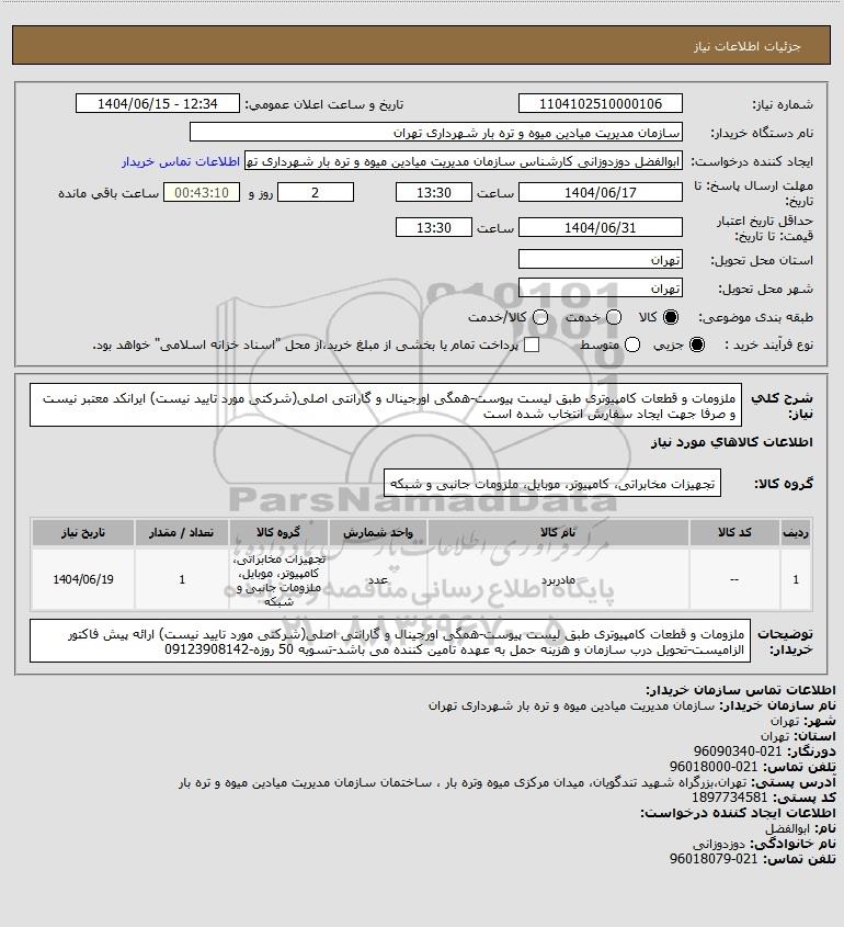 استعلام بها و موضوع استعلام استعلام ملزومات و قطعات کامپیوتری طبق لیست پیوست-همگی اورجینال و گارانتی اصلی(شرکتی مورد تایید نیست) ایرانکد معتبر نیست و صرفا جهت ایجاد سفارش انتخاب شده است به اطلاع کلیه شرکتها و افراد متخصص واجد شرایط میرساند، آگهی گذار در نظر دارد از طریق استعلام بها، نسبت به انتخاب و دریافت پیشنهادات اقدام نماید. این استعلام با کد آگهی ثبت شده در سامانه خبرگزاری پارس نماد : 9506268 منتشر شده است. مشخصات استعلام : تاریخ شروع استعلام: 1404/06/15 آخرین مهلت ارسال پیشنهاد قیمت : 1404/06/17 و محل اجرای پروژه : استان تهران میباشد. استعلام قیمت مورد درخواست : استعلام ملزومات و قطعات کامپیوتری طبق لیست پیوست-همگی اورجینال و گارانتی اصلی(شرکتی مورد تایید نیست) ایرانکد معتبر نیست و صرفا جهت ایجاد سفارش انتخاب شده است با دستهبندیهای تخصصی و گروه های مرتبط : کامپیوتر, استعلام اطلاع رسانی میگردد.
