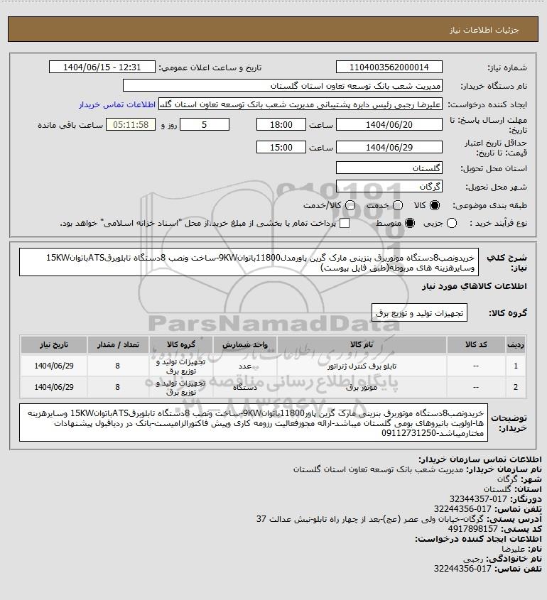 توضیحات خریدار:خریدونصب8دستگاه موتوربرق بنزینی مارک گرین پاور11800باتوان9KW-ساخت ونصب 8دستگاه تابلوبرقATSباتوان15KW وسایرهزینه ها-اولویت بانیروهای بومی گلستان میباشد-ارائه مجوزفعالیت رزومه کاری وپیش فاکتورالزامیست-بانک در ردیاقبول پیشنهادات مختارمیباشد-09112731250