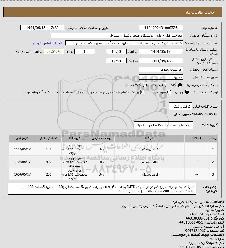 | 3 | -- | کاغذ پزشکی | رول | مواد اولیه، محصولات کاغذی و سلولزی | 200 | 1404/06/17 |