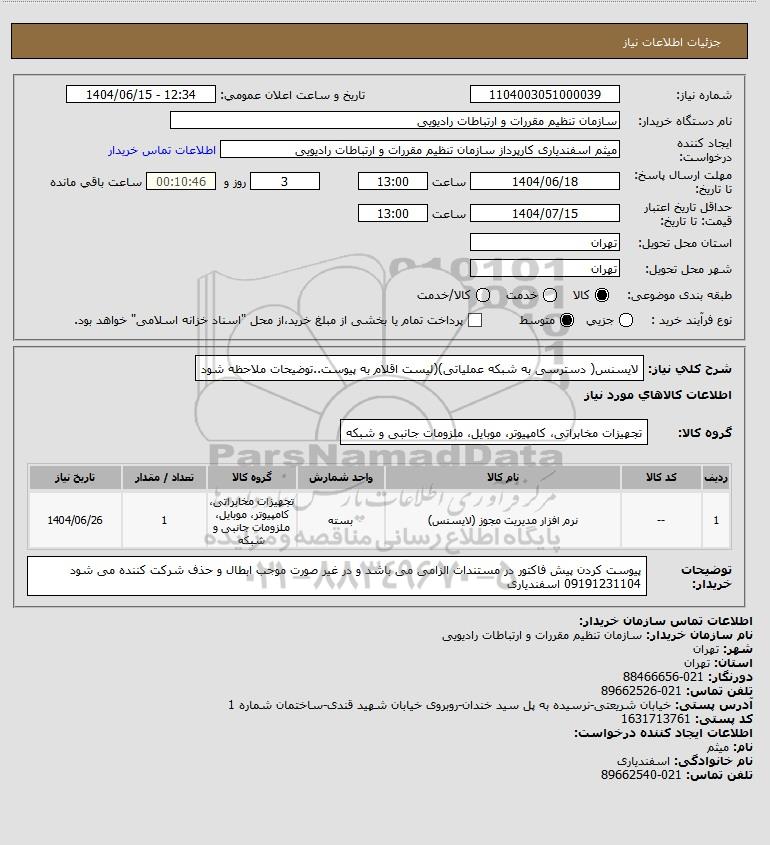 نام دستگاه خریدار:سازمان تنظیم مقررات و ارتباطات رادیویی