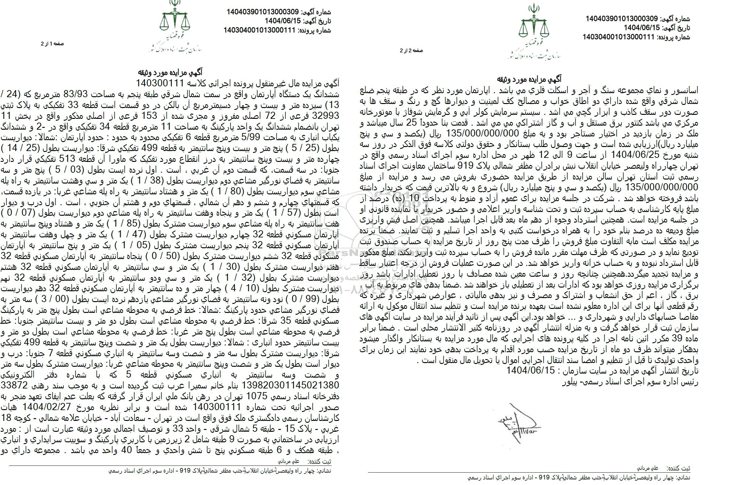 مزایده فروش ششدانگ یک دستگاه آپارتمان