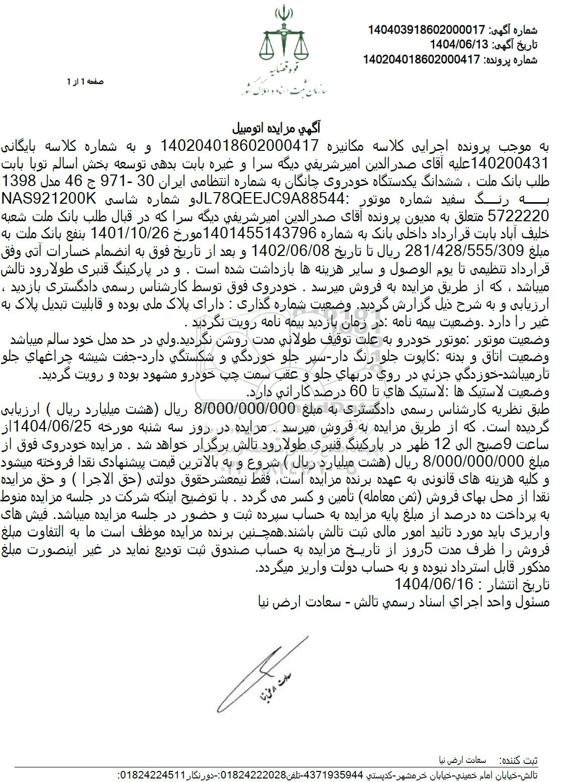 مزایده فروش ششدانگ یکدستگاه خودروی چانگان مدل 1398