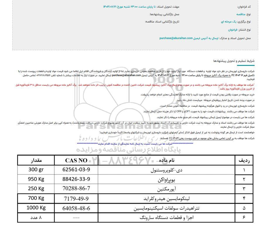 شرکت داروسازی ابوریحان در نظر دارد مواد اولیه و قطعات دستگاه مورد نیاز تولید خود را از طریق مناقصه عمومی خریداری نماید. لذا از تولید کنندگان و فروشندگان اقلام ذیل تقاضا میشود قیمت مواد اولیه و قطعات پیوست شده را با تکمیل فرم 12 1403 FC به همراه برگ آنالیز مربوطه تا پایان ساعت 23:00 شنبه مورخ 1404.6.21 به آدرس ایمیل purchase @aburaihan.com ارسال نمایید. در صورت نیاز به اطلاعات بیشتر با شماره تلفن 02177889516 تماس حاصل فرمایید.