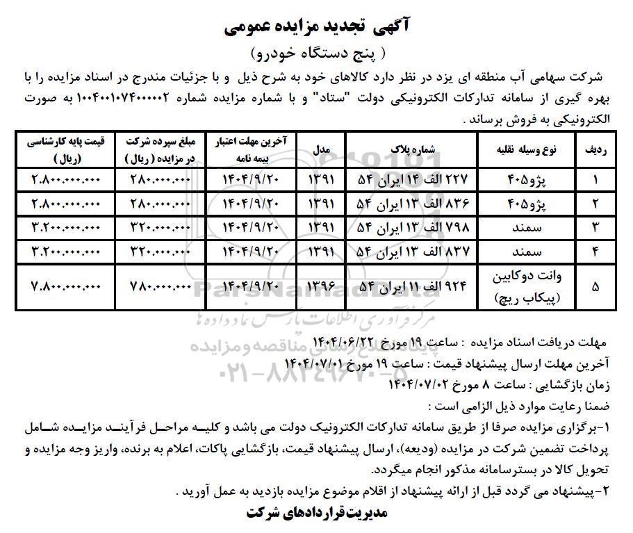 شرکت سهامی آب منطقه ای یزد در نظر دارد کالاهای خود به شرح ذیل و با جزئیات مندرج در اسناد مزایده را با بهره گیری از سامانه تدارکات الکترونیکی دولت ستاد و با شماره مزایده شماره 1004001074000002 به صورت الکترونیکی به فروش برساند.