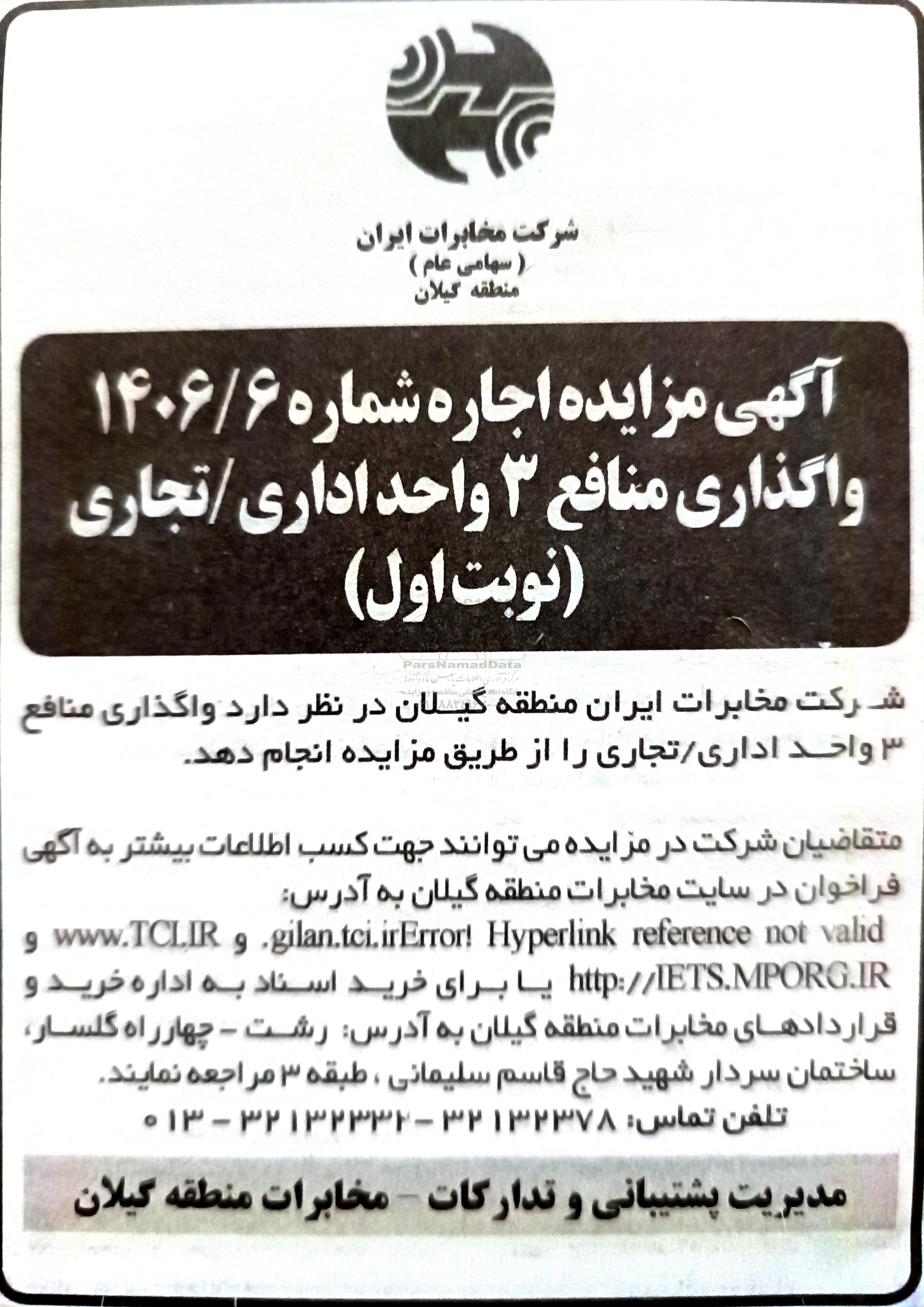 نوبت دومشرکت مخابرات ایران منطقه گیلان در نظر دارد نسبت به واگذاری منافع 3 واحد اداری/ تجاری را از طریق مزایده انجام دهد.