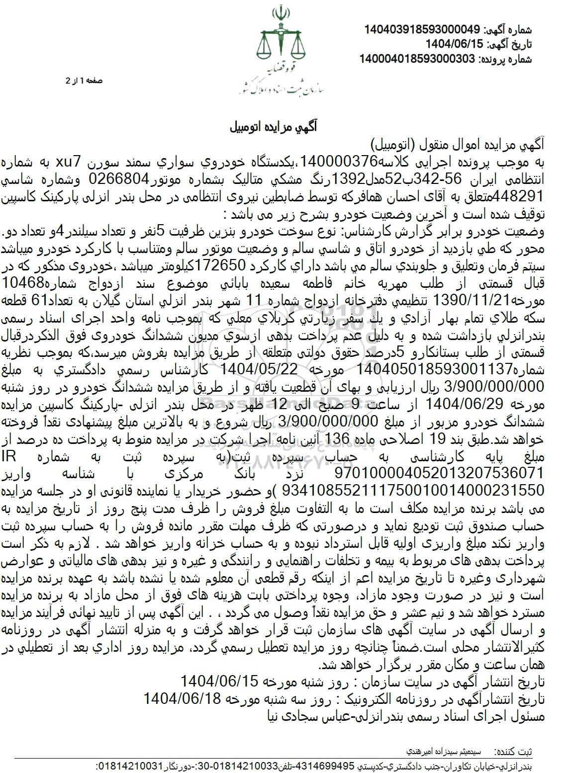 موضوع: مزایده یک دستگاه خودروی سواری سمند سورن xu7 به رنگ مشکی متالیک مدل 1392 به مبلغ 3.900.000.000 ریال