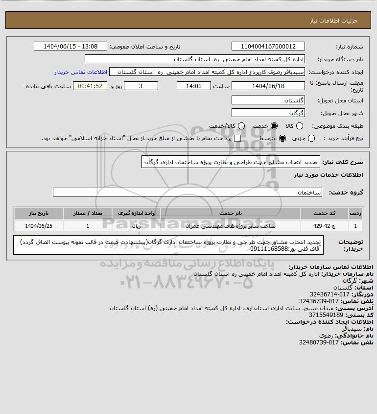 شرح کلی نیاز: تجدید انتخاب مشاور جهت طراحی و نظارت پروژه ساختمان اداری گرگان