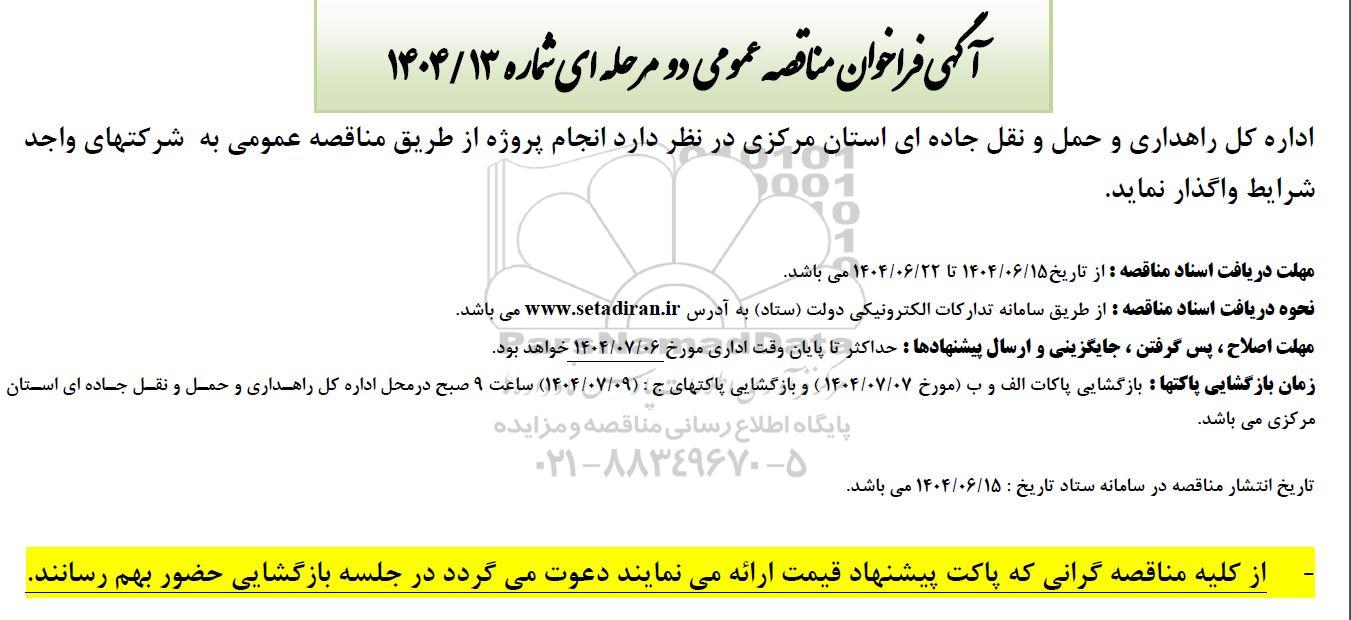 اداره کل راهداری و حمل و نقل جاده ای استان مرکزی در نظر دارد انجام پروژه از طریق مناقصه عمومی به شرکتهای واجد شرایط واگذار نماید