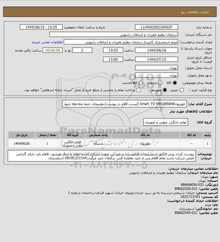 نام دستگاه خریدار:سازمان تنظیم مقررات و ارتباطات رادیویی