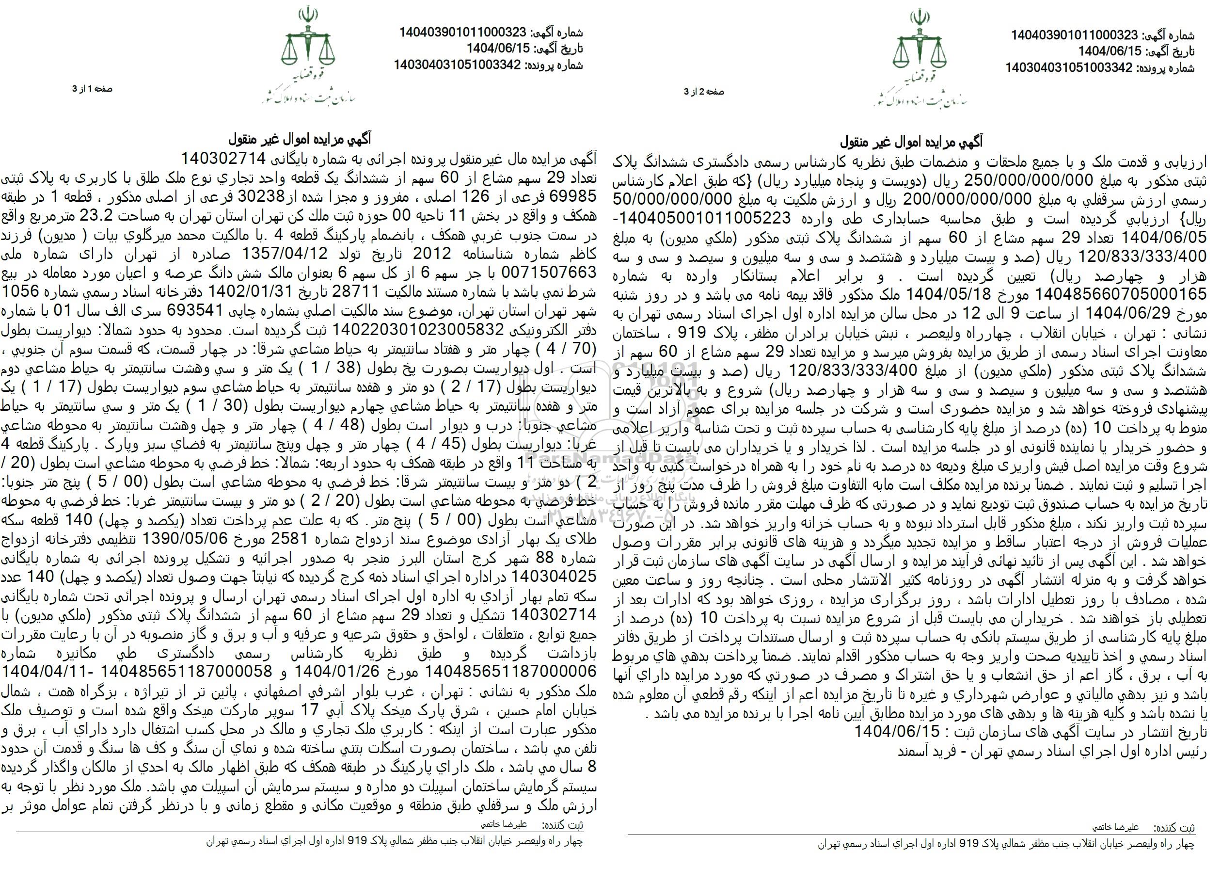 مزایده تعداد 29 سهم مشاع از 60 سهم ششدانگ یک قطعه تجاری کلاسه 140302714