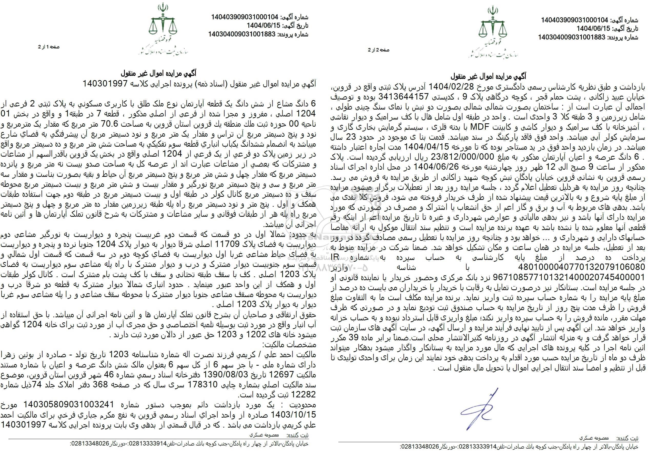 مزایده فروش 6 دانگ مشاع از شش دانگ یک قطعه آپارتمان نوع ملک طلق با کاربری مسکونی
