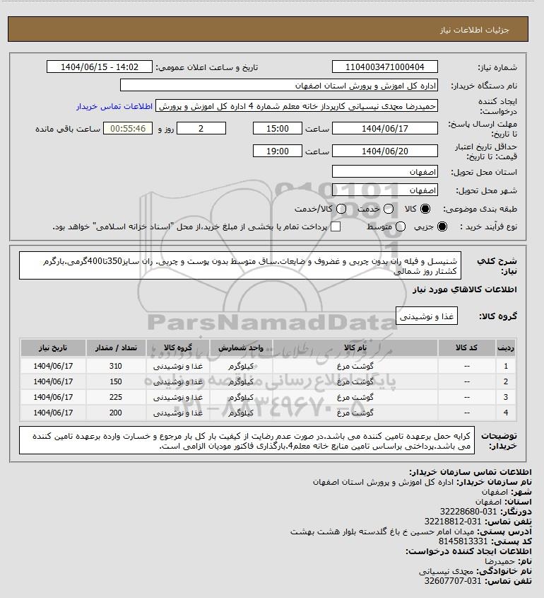 شرح کلی نیاز: شنیسل و فیله ران بدون چربی و غضروف و ضایعات.ساق متوسط بدون پوست و چربی. ران سایز350تا400گرمی.بارگرم کشتار روز شمالی