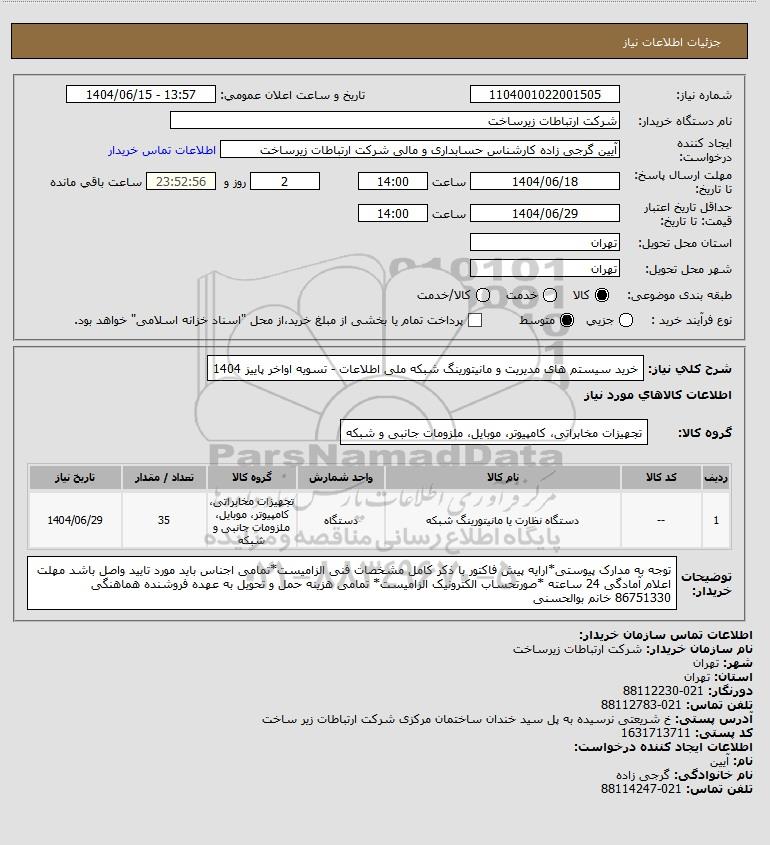 | 1 | -- | دستگاه نظارت یا مانیتورینگ شبکه | دستگاه | تجهیزات مخابراتی، کامپیوتر، موبایل، ملزومات جانبی و شبکه | 35 | 1404/06/29 |