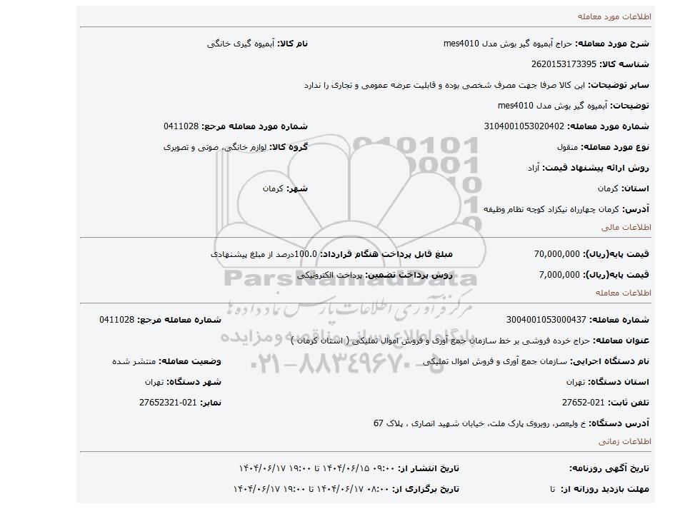 مزایده عمومی مزایده آبمیوه گیر بوش مدل mes4010 برگزار میگردد. از کلیه افراد متخصص و شرکت‌های واجد شرایط دعوت به عمل می‌آید تا در این مزایده با کد خبرگزاری پارس نماد : 9507501 شرکت نمایند تاریخ شروع مزایده : 1404/06/15 مهلت شرکت در مزایده: تا پایان روز 1404/06/17 مکان برگزاری اموال واگذاری استان‌های کرمان و دسته‌بندی‌های مربوط به این حراجی متفرقه میباشد.