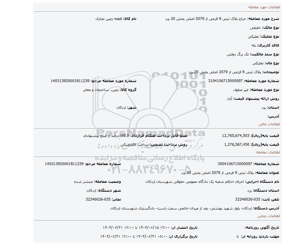 | عنوان معامله: پلاک ثبتی 9 فرعی از 2079 اصلی بخش 20 یزد | ||