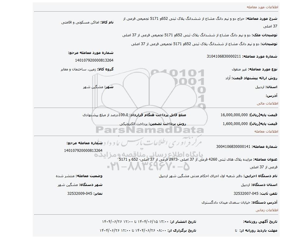 مزایده عمومی مزایده دو و نیم دانگ مشاع از ششدانگ پلاک ثبتی 652و 5171 تجمیعی فرعی از 37 اصلی برگزار میگردد. از کلیه افراد متخصص و شرکت‌های واجد شرایط دعوت به عمل می‌آید تا در این مزایده با کد خبرگزاری پارس نماد : 9507804 شرکت نمایند تاریخ شروع مزایده : 1404/06/15 مهلت شرکت در مزایده: تا پایان روز 1404/06/26 مکان برگزاری اموال واگذاری استان‌های اردبیل و دسته‌بندی‌های مربوط به این حراجی املاک و زمین میباشد. اطلاعات دقیق‌تر درباره شرایط شرکت در مزایده آنلاین و نحوه ارسال مدارک، الزامات پروژه و دریافت اسناد مزایده و تاریخ بازگشایی پاکت‌ها، در بخش اطلاعات تکمیلی این آگهی درج شده است.