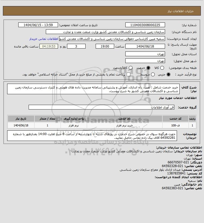 شرح کلی نیاز: خرید خدمت شامل : نصب، راه اندازی، آموزش و پشتیبانی سامانه مدیریت داده های هویتی و کنترل دسترسی سازمان زمین شناسی و اکتشافات معدنی کشور به شرح پیوست.