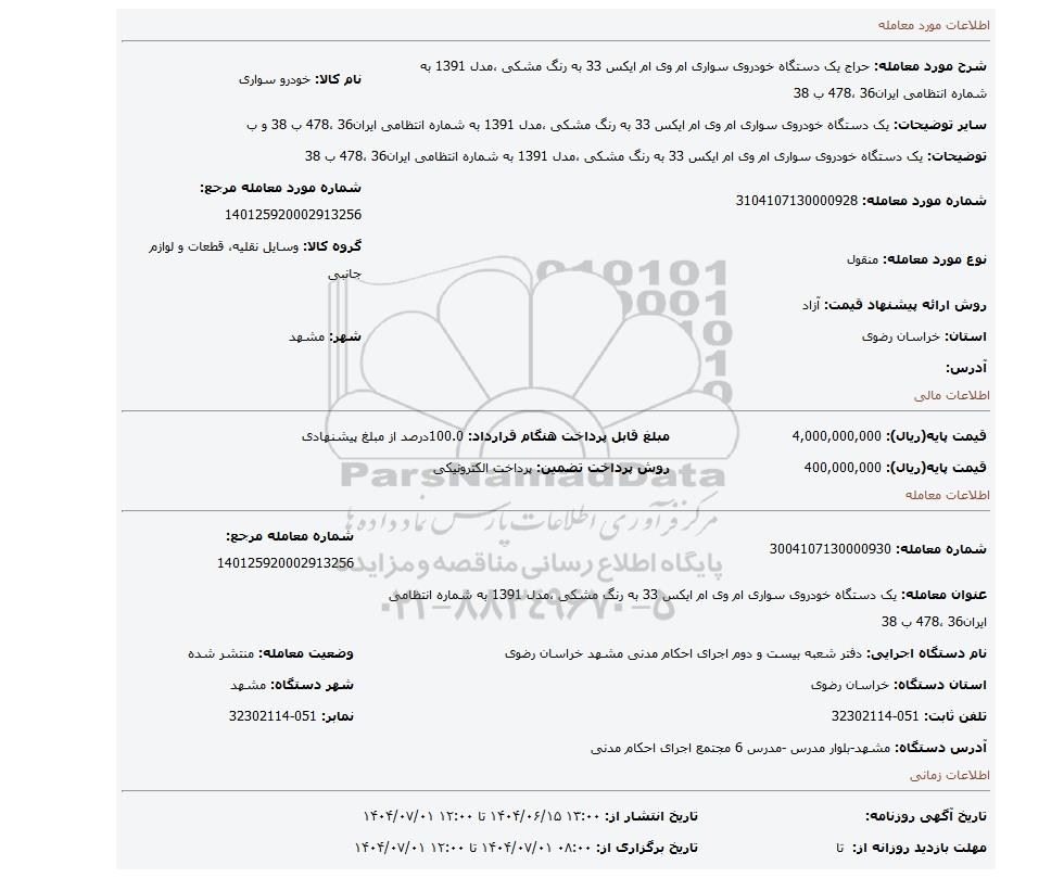 عنوان معامله: یک دستگاه خودروی سواری ام وی ام ایکس 33 به رنگ مشکی ،مدل 1391 به شماره انتظامی ایران36 ،478 ب 38