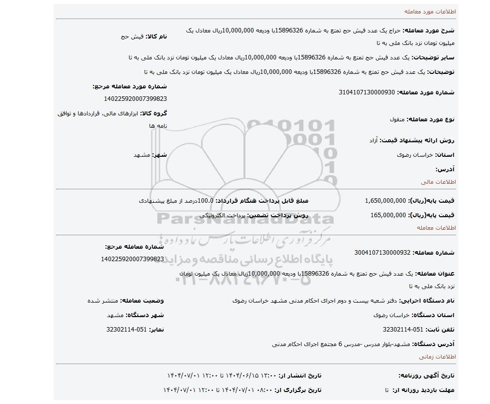 | عنوان معامله: یک عدد فیش حج تمتع به شماره 15896326با ودیعه 10,000,000ریال معادل یک میلیون تومان نزد بانک ملی به تا | ||