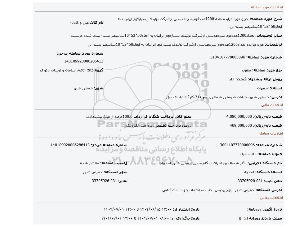 مزایده عمومی مزایده مورد مزایده تعداد1200عددفوم سردعدسی ازشرکت تولیدی بسپارفوم ایرانیان به ابعاد50*53*10سانتیمتر بسته بن برگزار میگردد. از کلیه افراد متخصص و شرکت‌های واجد شرایط دعوت به عمل می‌آید تا در این مزایده با کد خبرگزاری پارس نماد : 9507824 شرکت نمایند تاریخ شروع مزایده : 1404/06/15 مهلت شرکت در مزایده: تا پایان روز 1404/07/01 مکان برگزاری اموال واگذاری استان‌های اصفهان و دسته‌بندی‌های مربوط به این حراجی متفرقه میباشد. اطلاعات دقیق‌تر درباره شرایط شرکت در مزایده آنلاین و نحوه ارسال مدارک، الزامات پروژه و دریافت اسناد مزایده و تاریخ بازگشایی پاکت‌ها، در بخش اطلاعات تکمیلی این آگهی درج شده است.