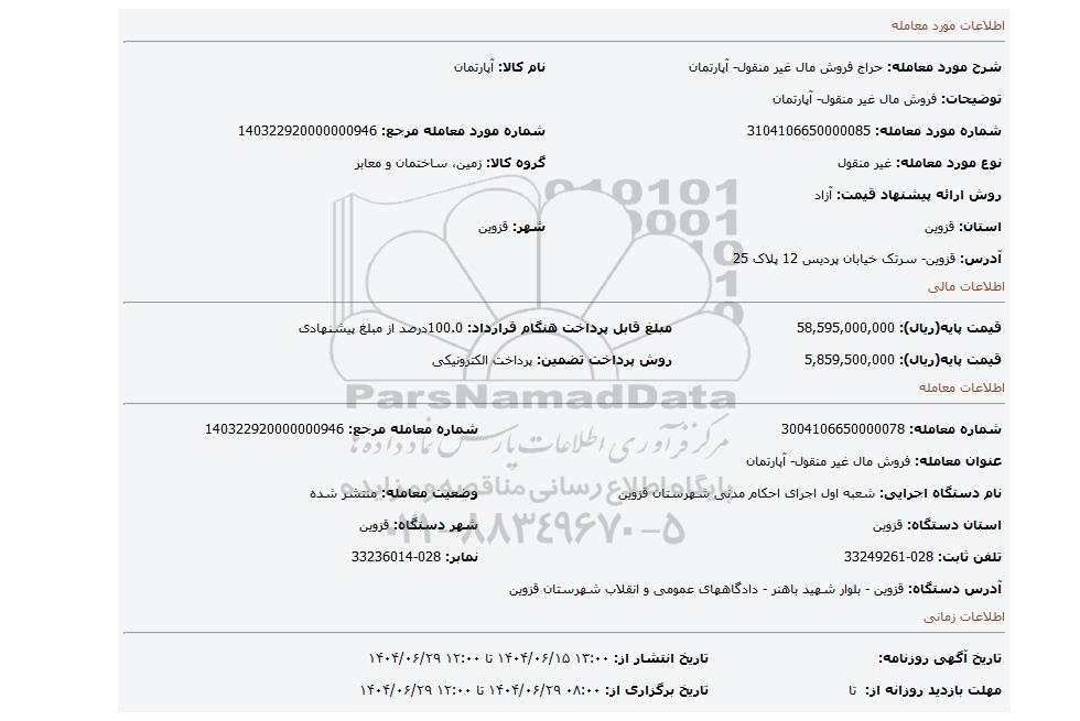 مزایده فروش مال غیر منقول- آپارتمان, مزایده، فروش مال غیر منقول- آپارتمان