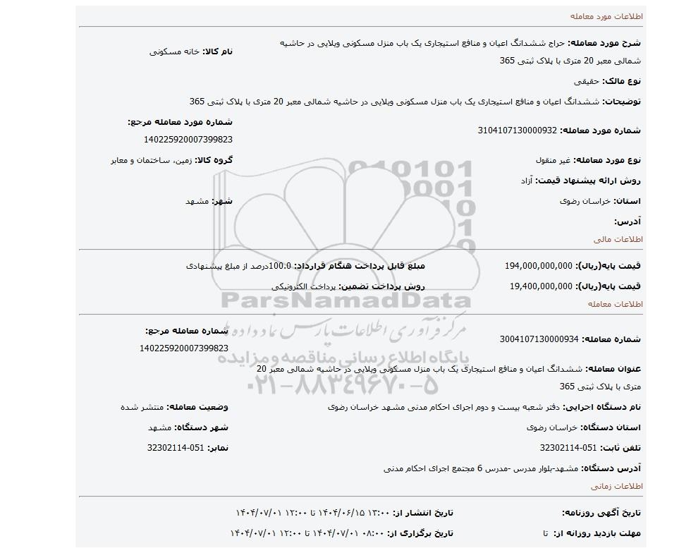 مزایده عمومی مزایده ششدانگ اعیان و منافع استیجاری یک باب منزل مسکونی ویلایی در حاشیه شمالی معبر 20 متری با پلاک ثبتی 365 برگزار میگردد. از کلیه افراد متخصص و شرکت‌های واجد شرایط دعوت به عمل می‌آید تا در این مزایده با کد خبرگزاری پارس نماد : 9507827 شرکت نمایند تاریخ شروع مزایده : 1404/06/15 مهلت شرکت در مزایده: تا پایان روز 1404/07/01 مکان برگزاری اموال واگذاری استان‌های خراسان رضوی و دسته‌بندی‌های مربوط به این حراجی املاک و زمین میباشد. اطلاعات دقیق‌تر درباره شرایط شرکت در مزایده آنلاین و نحوه ارسال مدارک، الزامات پروژه و دریافت اسناد مزایده و تاریخ بازگشایی پاکت‌ها، در بخش اطلاعات تکمیلی این آگهی درج شده است.
