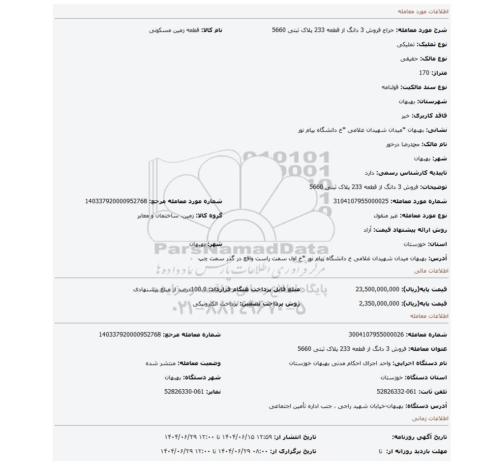 مزایده، فروش 3 دانگ از قطعه 233 پلاک ثبتی 5660
