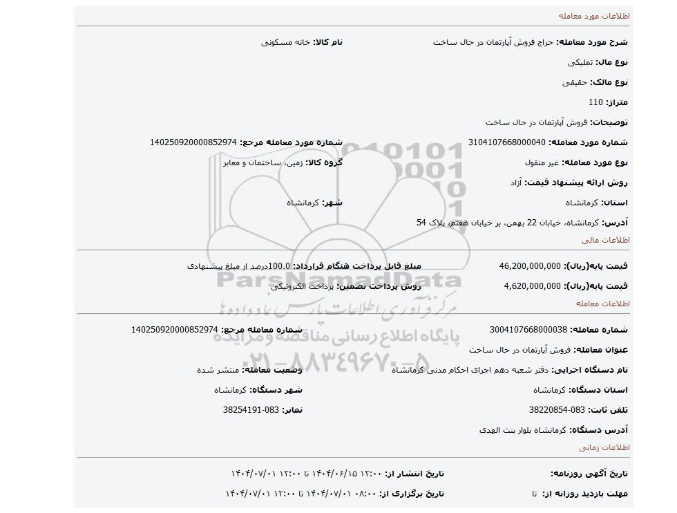 شرح مورد معامله: حراج فروش آپارتمان در حال ساختنام کالا: خانه مسکونی