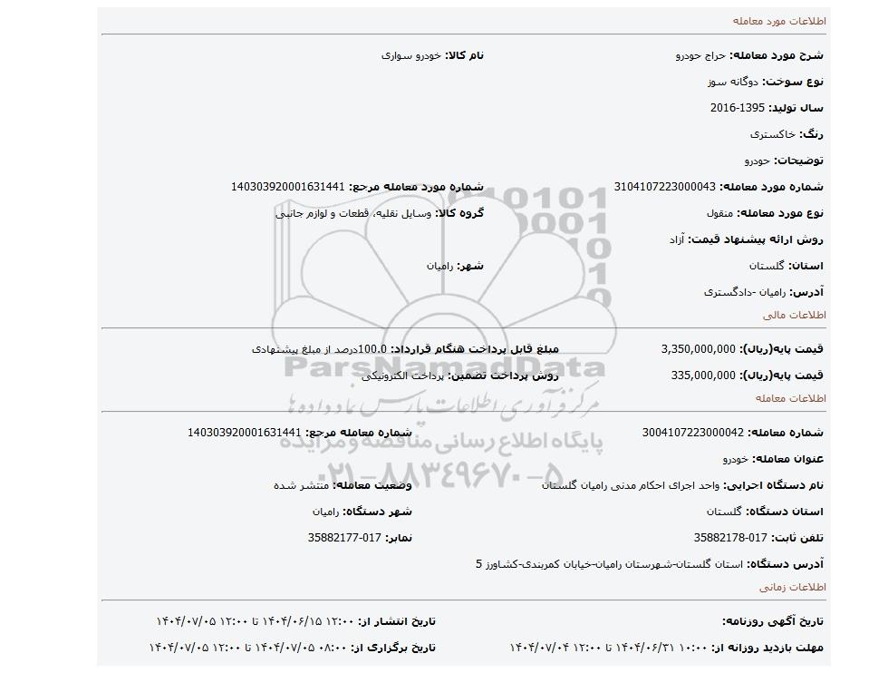 | نوع مورد معامله: منقول | گروه کالا: وسایل نقلیه، قطعات و لوازم جانبی | |