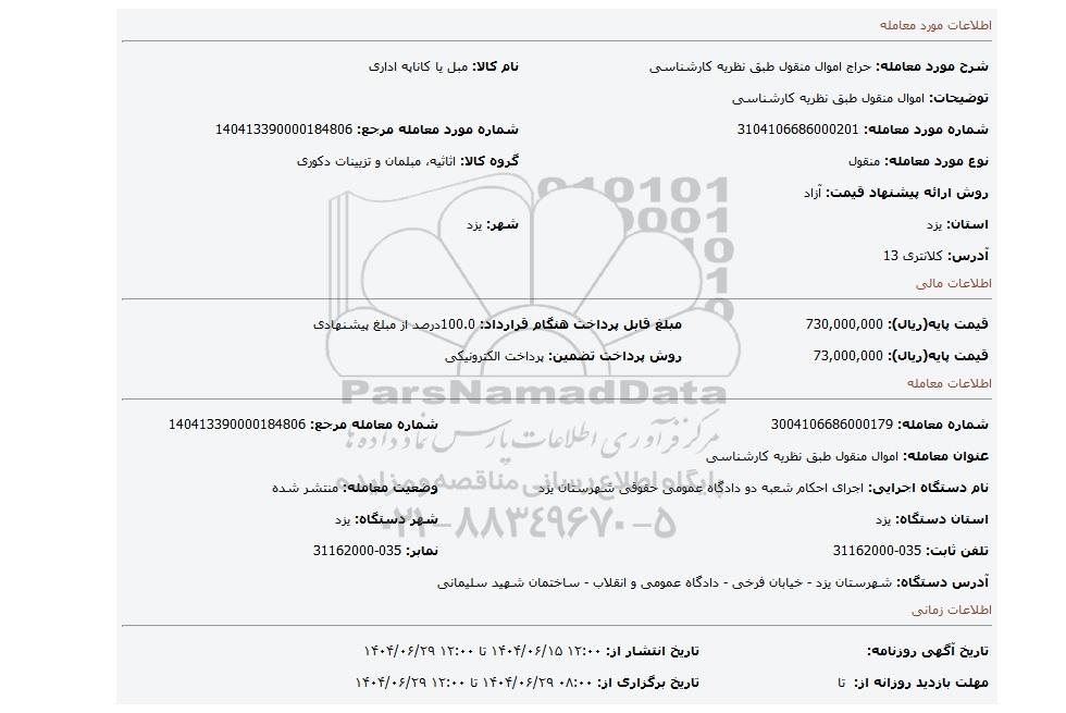 | نام دستگاه اجرایی: اجرای احکام شعبه دو دادگاه عمومی حقوقی شهرستان یزد | وضعیت معامله: منتشر شده | |