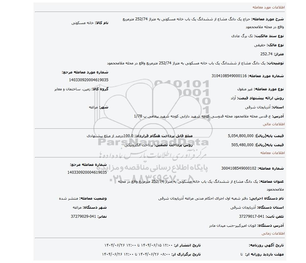 مزایده عمومی مزایده یک دانگ مشاع از ششدانگ یک باب خانه مسکونی به متراژ 252/74 مترمربع واقع در محله ملامححمود برگزار میگردد. از کلیه افراد متخصص و شرکت‌های واجد شرایط دعوت به عمل می‌آید تا در این مزایده با کد خبرگزاری پارس نماد : 9507841 شرکت نمایند تاریخ شروع مزایده : 1404/06/15 مهلت شرکت در مزایده: تا پایان روز 1404/06/26 مکان برگزاری اموال واگذاری استان‌های آذربایجان شرقی و دسته‌بندی‌های مربوط به این حراجی املاک و زمین میباشد. اطلاعات دقیق‌تر درباره شرایط شرکت در مزایده آنلاین و نحوه ارسال مدارک، الزامات پروژه و دریافت اسناد مزایده و تاریخ بازگشایی پاکت‌ها، در بخش اطلاعات تکمیلی این آگهی درج شده است.