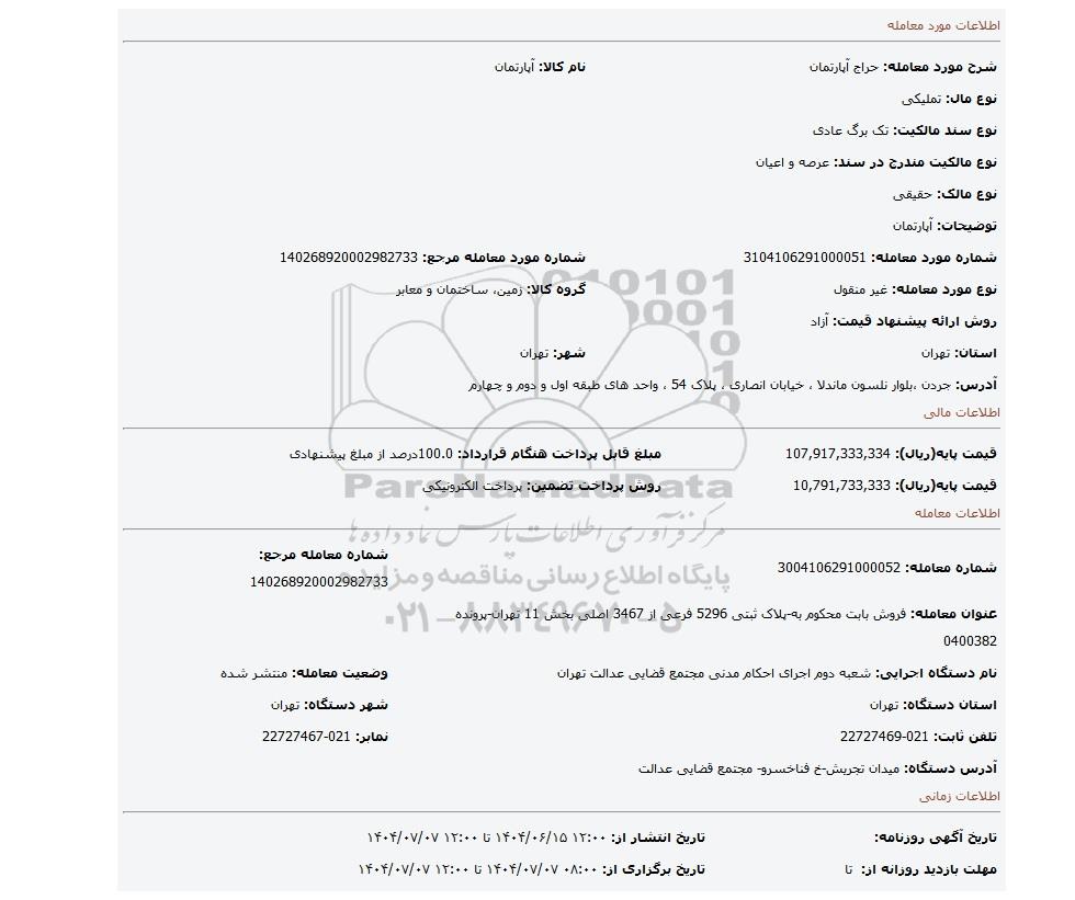 | شرح مورد معامله: حراج آپارتمان | نام کالا: آپارتمان | |