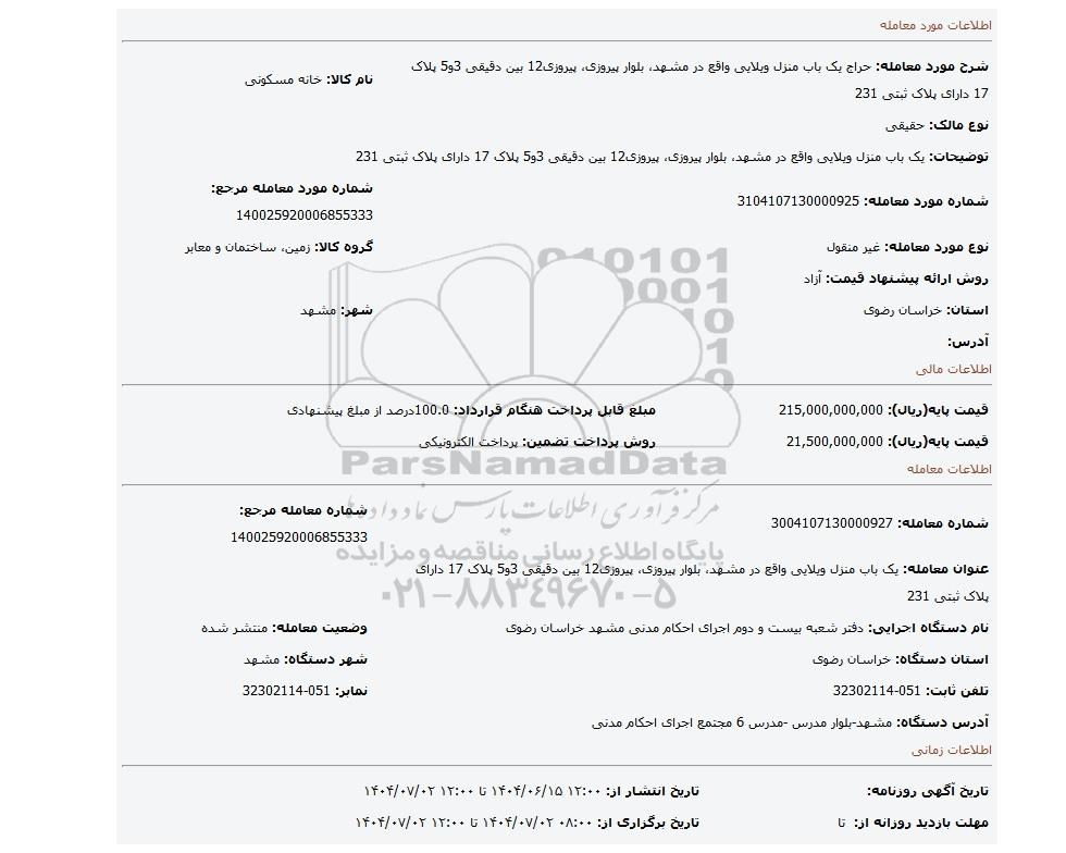| عنوان معامله: یک باب منزل ویلایی واقع در مشهد، بلوار پیروزی، پیروزی12 بین دقیقی 3و5 پلاک 17 دارای پلاک ثبتی 231 | ||