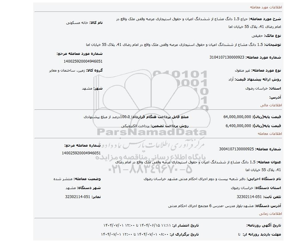 مزایده، 1.5 دانگ مشاع از ششدانگ اعیان و حقوق استیجاری عرصه وقفی ملک واقع در امام رضای 41، پلاک 55 خیابان اما