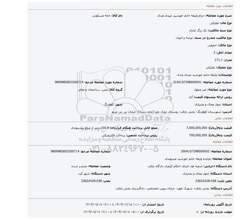 عنوان معامله: مزایده وثیقه خانم خورشید عیدیوندی