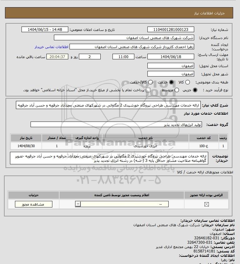 شرح کلی نیاز: ارائه خدمات مهندسی طراحی نیروگاه خورشیدی 2 مگاواتی در شهرکهای صنعتی محمدآباد جرقویه و حسن آباد جرقویه