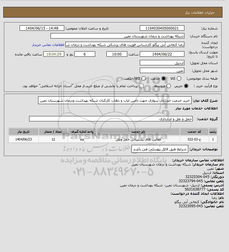شرح کلی نیاز: خرید خدمت خودروی سواری جهت تامین ایاب و ذهاب کارکنان شبکه بهداشت ودرمان شهرستان نمین