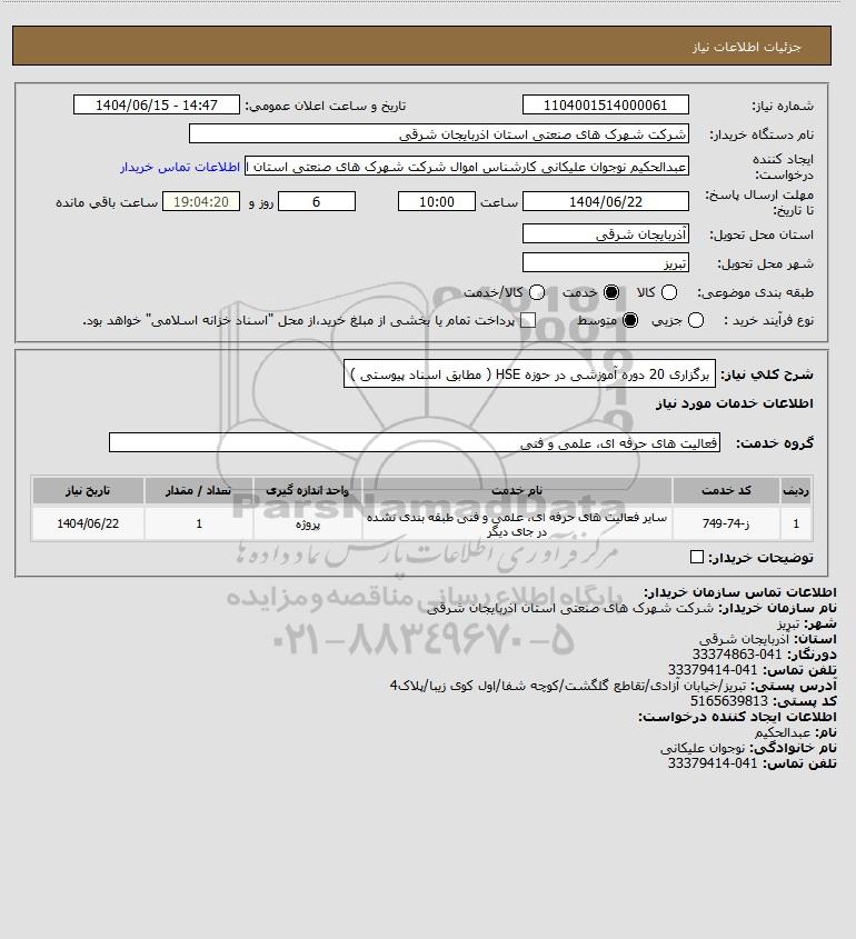 شرح کلی نیاز: برگزاری 20 دوره آموزشی در حوزه HSE ( مطابق اسناد پیوستی )