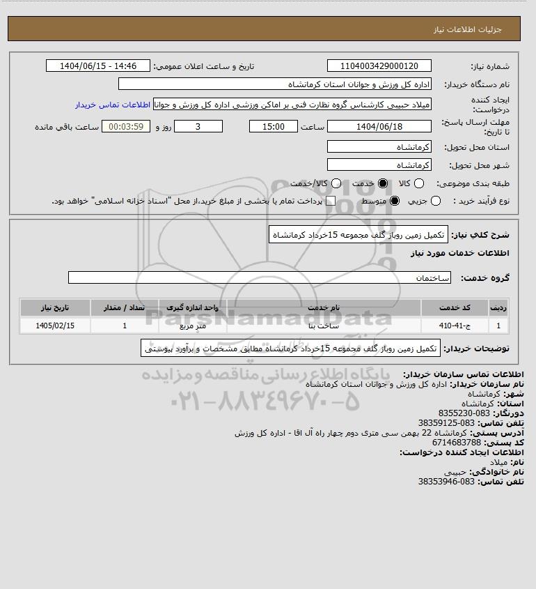 توضیحات خریدار:تکمیل زمین روباز گلف مجموعه 15خرداد کرمانشاه مطابق مشخصات و برآورد پیوستی