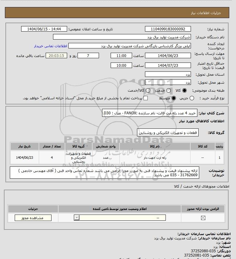 1 -- رله ارت جهت دار عدد قطعات و تجهیزات الکتریکی و روشنایی 4 1404/06/23