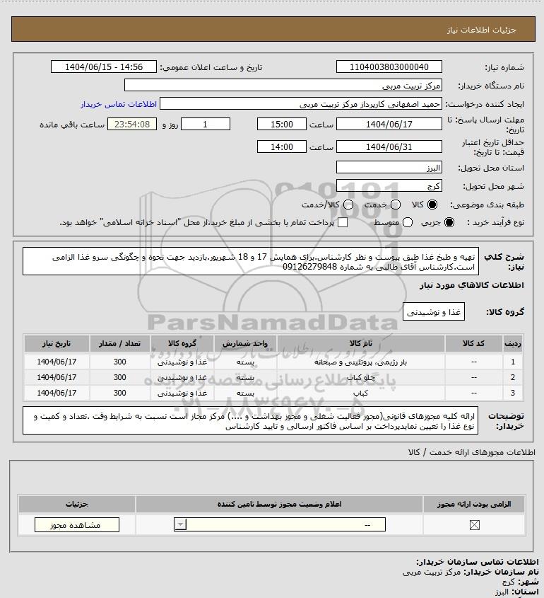 دانلود اسناد مناقصهاستعلام بها و موضوع استعلام استعلام تهیه و طبخ غذا طبق پیوست و نظر کارشناس.برای همایش 17 و 18 شهریور.بازدید جهت نحوه و چگونگی سرو غذا الزامی است.کارشناس آقای طالبی به شماره 09126279848 به اطلاع کلیه شرکتها و افراد متخصص واجد شرایط میرساند، آگهی گذار در نظر دارد از طریق استعلام بها، نسبت به انتخاب و دریافت پیشنهادات اقدام نماید. این استعلام با کد آگهی ثبت شده در سامانه خبرگزاری پارس نماد : 9507931 منتشر شده است. مشخصات استعلام : تاریخ شروع استعلام: 1404/06/15 آخرین مهلت ارسال پیشنهاد قیمت : 1404/06/17 و محل اجرای پروژه : استان البرز میباشد. استعلام قیمت مورد درخواست : استعلام تهیه و طبخ غذا طبق پیوست و نظر کارشناس.برای همایش 17 و 18 شهریور.بازدید جهت نحوه و چگونگی سرو غذا الزامی است.کارشناس آقای طالبی به شماره 09126279848 با دستهبندیهای تخصصی و گروه های مرتبط : طبخ غذا, مواد غذایی, استعلام اطلاع رسانی میگردد. شرایط شرکت در استعلام آنلاین : ابتدا ثبت نام در سامانه استعلام پارس نماد و تکمیل مدارک موردنیاز و بارگذاری در سامانه رعایت تمامی ضوابط و الزامات مندرج در اسناد استعلام است.