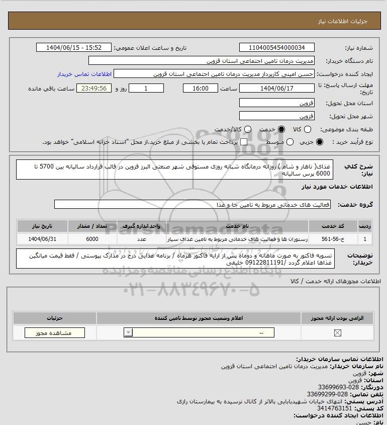 شرح کلی نیاز: غذای( ناهار و شام ) روزانه درمانگاه شبانه روزی مستوفی شهر صنعتی البرز قزوین در قالب قرارداد سالیانه بین 5700 تا 6000 پرس سالیانه