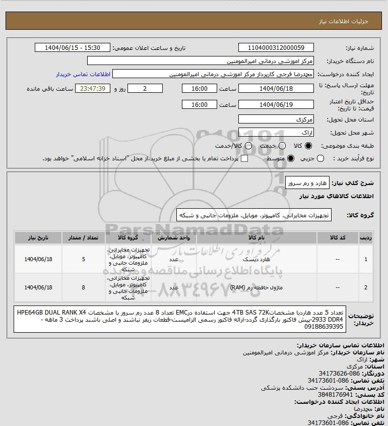 1 -- هارد دیسک عدد تجهیزات مخابراتی، کامپیوتر، موبایل، ملزومات جانبی و شبکه 5 1404/06/18