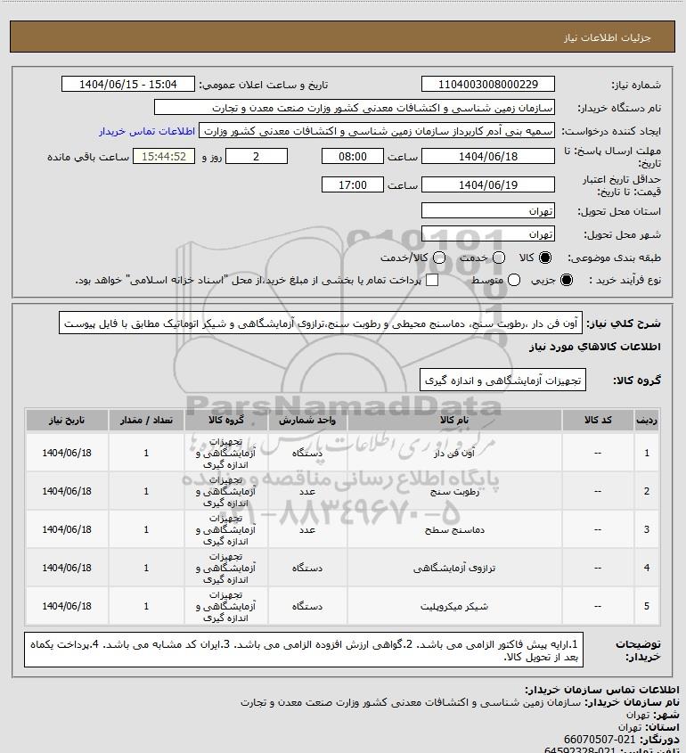 شرح کلی نیاز: آون فن دار ،رطوبت سنج، دماسنج محیطی و رطوبت سنج،ترازوی آزمایشگاهی و شیکر اتوماتیک مطابق با فایل پیوست