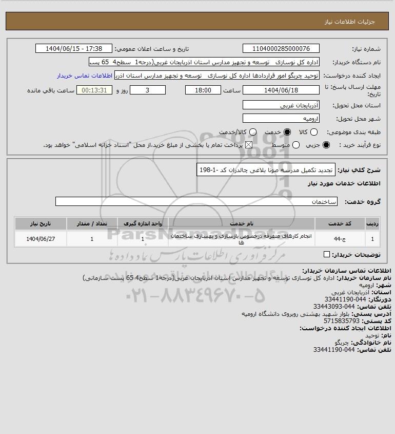 شرح کلی نیاز: تجدید تکمیل مدرسه صونا بلاغی چالدران کد -1-198