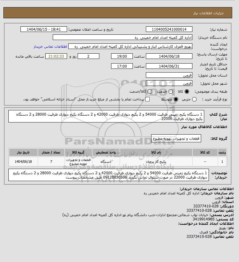 شرح کلی نیاز: 1 دستگاه پکیج زمینی ظرفیت 54000 و 2 پکیچ دیواری ظرفیت 42000 و 2 دستگاه پکیج دیواری ظرفیت 28000 و 2 دستگاه پکیج دیواری ظرفیت 22000